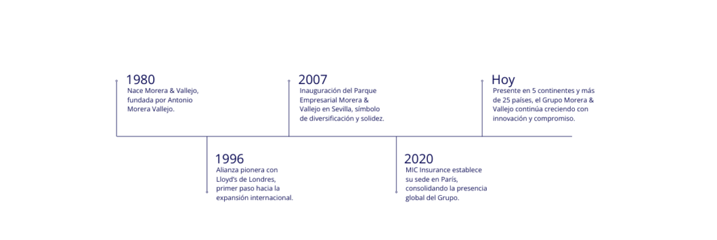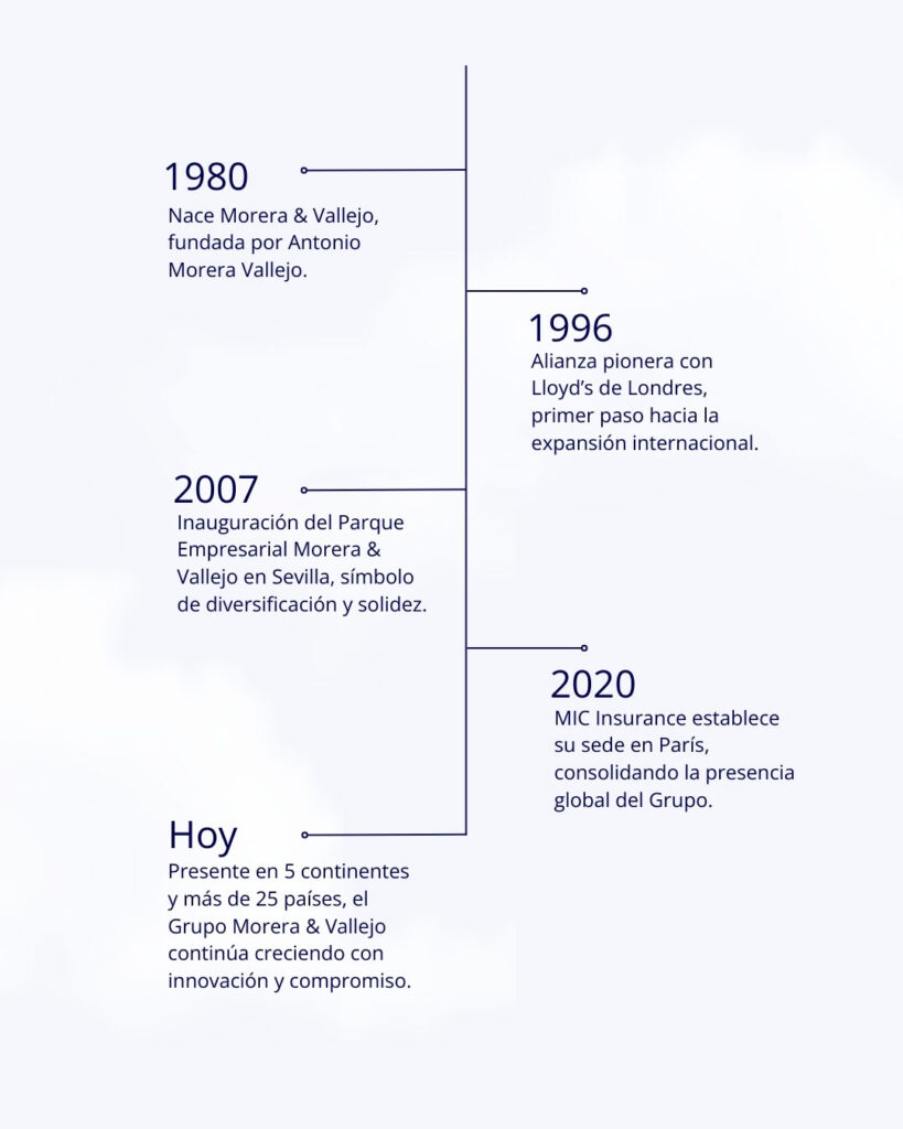 La trayectoria de Morera & Vallejo es muy relevante y motivante para el sector asegurador pues ha ido evolucionando de Correduría de Seguros y Reaseguro a Agencias de Suscripción, y también con la creación de Compañías de Seguros y Reaseguros, que operan tanto a nivel nacional como internacional.